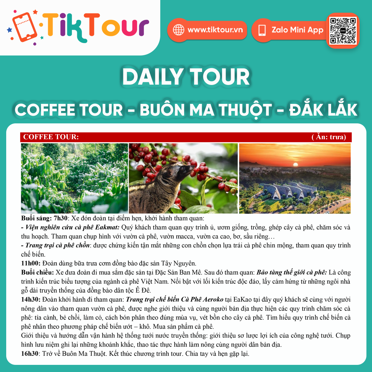 Đặt vé COFFEE TOUR - BUÔN MA THUỘT - ĐẮK LẮK giá chỉ từ 1.050.000 ₫ trên TikTour. Giá vé ưu đãi hấp dẫn, thao tác mua vé đơn giản, thanh toán tiện lợi, nhận vé tức thì. Đặt ngay!
