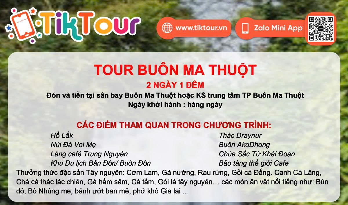 Đặt vé Tour ghép đoàn Đắk Lắk - Bản Sắc Tây Nguyên giá chỉ từ 4.950.000 ₫ trên TikTour. Giá vé ưu đãi hấp dẫn, thao tác mua vé đơn giản, thanh toán tiện lợi, nhận vé tức thì. Đặt ngay!