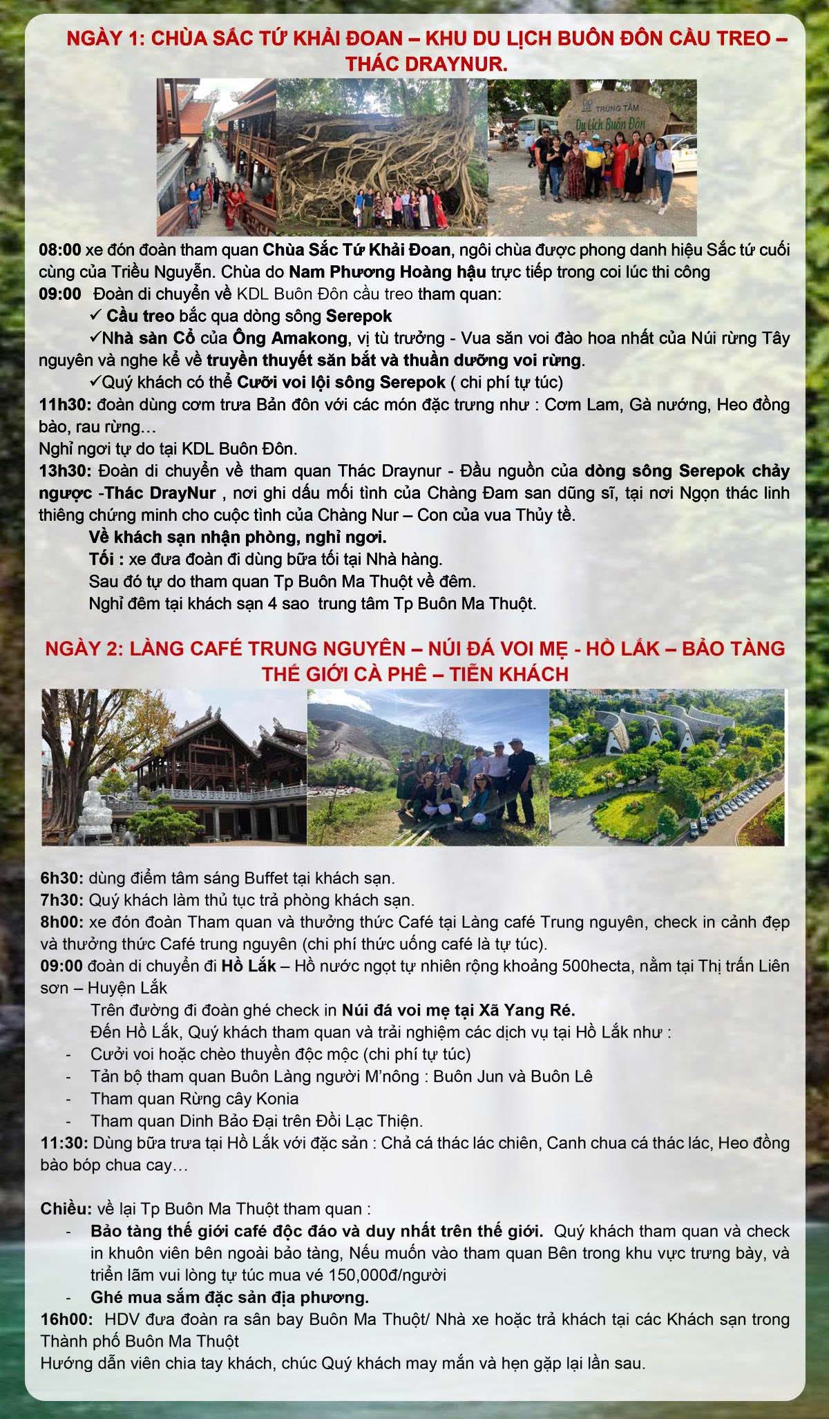 - Ăn trưa, chiều 03 bữa đặc sản tây nguyên, mức 150.000đ/bữa/người.